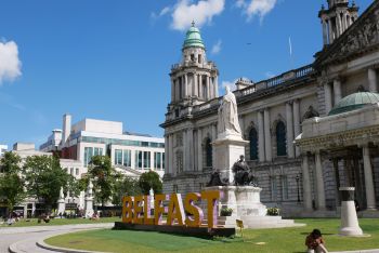 In Belfast troffen we een prettige stad met mooie gebouwen. Onze fietsen vonden in de hotelkamer een veilig plekje. En het was prachtig weer. Tot we de volgende ochtend verder gingen fietsen. Voor het eerst in een week moest de regenjas aan. En die bleef ook aan voor twee hele dagen. In de bar van het hotel waar de camping bijhoorde werden we aangesproken door een Spaanse fietsreiziger (z’n eerste) die al jaren in Dublin woonde en van ons tips wilde om toch vooral gemotiveerd te blijven op de fiets in dit weer. Hij zat er nogal doorheen. Vond het fietsen zwaar en het weer kwam daar nog eens bovenop. Ben benieuwd of er voor hem nog een tweede keer komt.