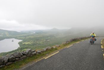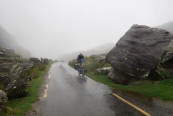 We fietsen door de Slieve Mish Mountains en lunchen in de Climbers Inn, waar we op tv de voorbeschouwing zien van de hurling-finale Cork vs Clare. Later horen we dat Clare won. Wij fietsen verder over de Ballaghbeama Gap en door de Highlands of Kerry. Het is er nattig, winderig en nevelig, waardoor we helaas weinig uitzicht hebben op de omgeving.