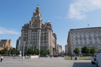 Net voor Liverpool moeten we met een ferry de Mersey oversteken. Waar kennen we dat toch van? En hoewel we in Liverpool meteen noordwaarts vertrekken beloven de mooie gebouwen die we zien staan een interessante stad. Iets voor later.